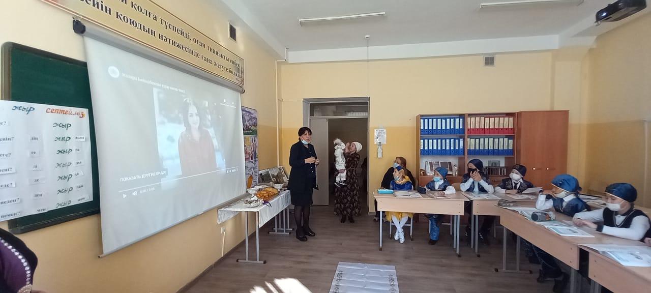 Қазақ тілі мен әдебиеті пәнінің мұғалімі, педагог-сарапшы,педагогика ғылымдарының магистрі Лекерова Данагүл Ержұмақызының 4 "А" сынып оқушыларымен қазақ тілі пәнінен "Тұсаукесер жыры" тақырыбында өткен ашық сабағы.Сабақтың мақсаты: өзге ұлт өкілдеріне қазақ халқының салт-дәстүрін көрсету,таныстыру,тұсаукесер жырын айту, ала жіптің мағынасын түсіндіру.
